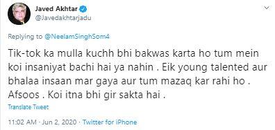 ‘टिकटॉकवाले मौलवी काहीही बकवास करोत. पण तुझ्यात मानवता शिल्लक आहे की नाही? एक प्रतिभावान आणि तरूण व्यक्ती जगातून गेली आणि तु खिल्ली उडवतेस. दु:खद, कोणी इतक्या खालच्या स्तराला जाऊन कसे बोलू शकतं,’ अशा शब्दांत या युजरने जावेद यांनी उत्तर दिले.