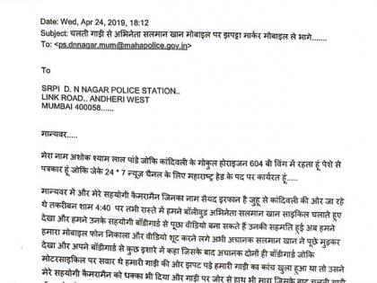 बुधवारी संध्याकाळी ४.४०च्या सुमारास सलमान आणि त्याचे काही बॉडीगार्ड जुहू रस्त्यावर सायकलिंग करताना दिसला. सलमानला दिवसाढवळ्या मुंबईच्या रस्त्यावर सायकलिंग करताना पाहून अनेकांना कुतूहल वाटले. संबंधित पत्रकार व त्याचा कॅमेरामॅन याच मार्गावरून जात असताना त्यांना सलमान सायकलिंग करत असताना दिसला. यानंतर त्यांनी सलमानचा व्हिडीओ शूट करण्याचा प्रयत्न केला. पण त्यांना व्हिडीओ शूट करताना पाहून सलमान भडकला आणि त्याने संबंधित पत्रकाराचा मोबाईल हिसकावून घेतला. काही वेळाने सलमानच्या बॉडीगार्डने त्यांना हा मोबाईल परतही केला. हे प्रकरण इथेच शांत झाले असे वाटत असताना श्याम लाल पांडे यांनी पोलिस ठाण्यात तक्रार दाखल केली. ‘सलमान एक सेलिब्रिटी आहे आणि या नात्याने कुणाच्या गाडीत हात टाकून तो मोबाईल हिसकावू शकत नाही. त्यामुळे त्याच्याविरोधात कारवाई करावी,’ असे त्यांनी या तक्रारीत म्हटले आहे.