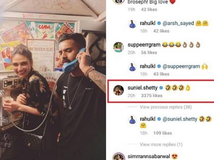 के एल राहुलने शेअर केलेल्या फोटात, त्याच्या कानाला फोनचा रिसिव्हर लागलेला आहे. तर त्याचा बाजूला उभी असलेली अथिया हसताना दिसतेय. ‘हॅलो, देवीप्रसाद...?’, असे कॅप्शन राहुलने हा फोटो शेअर करताना दिले आहे. ‘हॅलो, देवीप्रसाद...?’ हे वाक्य सुनील शेट्टीच्या ‘हेराफेरी’ चित्रपटातील आहे, हे तुम्ही जाणताच. सुनील शेट्टीची या फोटोवर आणि त्याच्या कॅप्शनवर नजर गेली आणि त्याने गोड कमेंट दिली. त्याने यावर लाफिंग इमोजी पोस्ट केले.