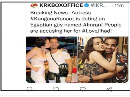 केआरकेने कंगनाबद्दल एक ट्वीट केलं आणि काही वेळानंतर ते डिलीटही केलं. पण तोपर्यंत त्याच्या या ट्वीटचे स्क्रिनशॉट्स व्हायरल झाले होते. या ट्वीटमध्ये केआरकेने कंगना इम्रान नावाच्या व्यक्तिसोबत रिलेशनशिपमध्ये असल्याचे म्हटले आहे. ट्वीटसोबत कंगनाचे दोन फोटोही त्याने शेअर केले होते. फोटोतील कंगनासोबत दिसणारी व्यक्ती इम्रान आहे, असा केआरकेचा दावा आहे.