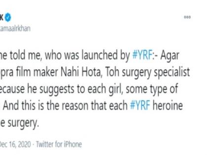 ‘आदित्य चोप्रा निर्माता नसता तर सर्जरी तज्ज्ञ असता, असे यशराजने लॉन्च केलेली एक अभिनेत्री मला म्हणाली. कारण आदित्य प्रत्येक मुलीला कोणती ना कोणती सर्जरी करण्याचा सल्ला देतो. यामुळेच यशराजच्या प्रत्येक हिरोईनने सर्जरी केलेली दिसते,’ असे ट्वीट केआरकेने केले.