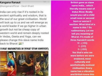 कंगनाने इन्स्टाग्रामवर दोन स्टोरी पोस्ट केल्या आहेत. यात तिने भारत व इंडिया यांच्यातील फरक दर्शवला आहे. (Kangana Ranaut calls for abolition of slave name says india should be called bharat instead)