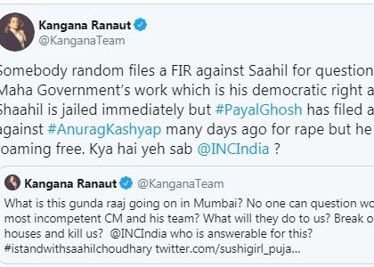 ‘ अनुरागविरोधात बलात्काराच्या आरोपात एफआयआर दाखल झाला असताना मुंबई पोलिसांनी अद्याप त्याला अटक का केली नाही? महाराष्ट्र सरकारच्या कारभारावर प्रश्न उपस्थित करणा-या  साहिल चौधरीला (साहिल एक युट्यू ब्लॉगर व मॉडेल आहे. सुशांत प्रकरणावरून त्याने महाराष्ट्रातील अनेक राजकीय नेत्यांवर आरोप केले होते.) मात्र एफआयआर दाखल होताच तुरुंगात पाठवले गेले. पायल घोषसोबत लैंगिक गैरवर्तन करणारा अनुराग मात्र मोकाट फिरतो आहे. हे काय सुरु आहे?’, असे ट्विट कंगनाने केले.