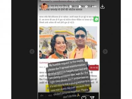 कंगनाने तिच्या इन्स्टाग्राम अकाऊंटवरुन तिचा आणि निशांत पिट्टी यांचा व्हायरल फोटो शेअर केला आहे. हा फोटो शेअर करत कंगनाने डेट करत असल्याचं कबुल केलं आहे. पण, कंगना निशांत शेट्टी यांना डेट करत नसून वेगळ्याच कोणत्या तरी व्यक्तीला डेट करत आहे. इन्स्टा स्टोरीमध्ये कंगना म्हणते, "मीडियाला मी विनंती करते की त्यांनी चुकीची माहिती पसरवू नये. निशांत पिट्टी हे विवाहित आहेत. आणि मी कोणत्या तरी दुसऱ्या व्यक्तीला डेट करत आहे. योग्य वेळेला मी सांगेन. फक्त फोटो काढले म्हणून एका तरुणीचं नाव रोज नव्या व्यक्तीबरोबर जोडणं बरोबर नाही. कृपया हे करू नका." कंगनाच्या या पोस्टमुळे ती निशांत पिट्टी यांना डेट करत नसल्याचं स्पष्ट झालं आहे. पण, कंगना नक्की कोणाला डेट करतेय याबाबत तिने अद्याप कोणतीही माहिती दिलेली नाही.