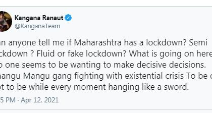 ‘महाराष्ट्रात लॉकडाऊन लागले का, कोणी मला सांगू शकेल का? हे सेमी लॉकडाऊन आहे की नकली लॉकडाऊन? काय सुरु आहे इथे? कदाचित कोणीच कठोर निर्णय घेऊ इच्छित नाही. डोक्यावर तलवार लटकत असताना चंगू मंगू गँग आपल्या अस्तित्वाची लढाई लढतेय. आपण राहू की नाही, या चिंतेने त्यांना ग्रासले आहे,’ असे ट्विट कंगनाने केले.