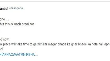 ‘सर्वांना हॅलो, रात्री काम करतेय आणि सध्या धाकड क्रूचा लंच ब्रेक आहे. तेव्हा कू का करू नये? ही माझ्यासाठी नवी जागा आहे, त्यामुळे समजण्यास थोडा वेळ लागले. पण भाड्याचे घर शेवटी भाड्याचे असते आणि आपले घर आपलेच असते...,’ असे कंगनाने लिहिले आहे.
