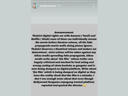 कोरोना व्हायरसच्या 'थलायवी' डिजिटल प्लेटफॉर्मवर रिलीज करण्यात येईल या रिपोर्टवर कंगना राणौत आपली प्रतिक्रिया देत होती. ही बातमी खोटी असल्याचे कंगना म्हणाली. आपल्या इन्स्टास्टोरीवर कंगना लिहिले, "थलाईवीचे डिजिटल हक्क अॅमेझॉन (तमिळ) आणि नेटफ्लिक्स (हिंदी) कडे आहेत."