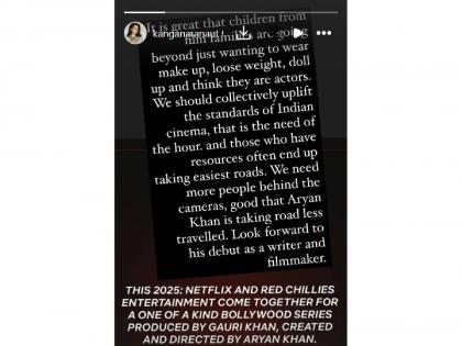 नेपोटिझमवरुन नेहमी स्टार कलाकारांना लक्ष्य करणाऱ्या कंगनाने यावेळी आर्यन खानचं मात्र कौतुक केलं आहे. कंगना रणौतने इन्स्टाग्रामवर स्टोरी शेअर करत लिहिले, "फिल्म कुटुंबातील मुलं पदार्पण करताना नुसतं मेकअप लावून, वजन कमी करुन, बाहुली बनून स्वत:ला हिरो हिरोईन समजत असतात. भारतीय सिनेमाचा स्तर उंचवण्यासाठी सर्वांनी एकत्र आलं पाहिजे हे आता गरजेचं आहे. ज्यांना सहज फिल्म इंडस्ट्रीत येता येतं ते बरेचदा सोपी वाटच निवडतात. पण आपल्याला कॅमेऱ्यामागेही काही लोकांची गरज आहे. आर्यन खानने असा मार्ग निवडला आहे जो खूप कमी लोक निवडतात हे पाहून बरं वाटलं. त्याच्या लेखक आणि फिल्ममेकर म्हणून पदार्पणासाकडे लक्ष लागलं आहे."