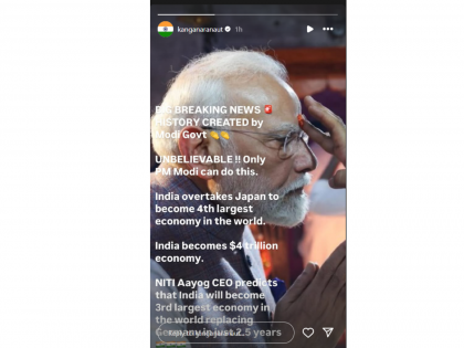 कंगना राणौतनं इंस्टाग्राम स्टोरीवर पंतप्रधान नरेंद्र मोदींचा एक फोटो शेअर केला आहे, ज्यामध्ये पंतप्रधान कपाळावर टिळक लावताना दिसत आहेत. या फोटोसोबत कंगनाने लिहिले, "अविश्वसनीय!! हे फक्त पंतप्रधान मोदीच करू शकतात. भारत जपानला मागे टाकत चौथी सर्वात मोठी अर्थव्यवस्था बनला आहे. भारत ४ ट्रिलियन डॉलर्सची अर्थव्यवस्था बनला आहे". यासोबतच जर भारताने आपल्या योजनांवर दृढतेने काम केले, तर पुढील अडीच ते तीन वर्षांत ते जर्मनीला मागे टाकून तिसरी सर्वात मोठी अर्थव्यवस्था बनेल, असं नीती आयोगाच्या अध्यक्षांनी म्हटल्याचंही कंगनाने सांगितलं.