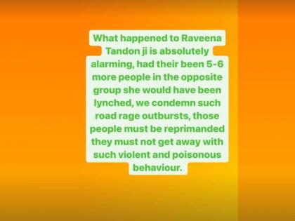कंगना रणौतने इन्स्टाग्रावर स्टोरी शेअर करत लिहिले, "रवीनासोबत जे झालं ती धोक्याची घंटा आहे. तिच्या विरोधात जर आणखी ५-६ लोक असते तर तिला त्यांनी ठारच मारलं असतं. रस्त्यावरील अशा प्रकारच्या उद्रेकाचा निषेध केला पाहिजे. अशा लोकांना फटकारलं पाहिजे. अशा प्रकारे विचित्र आणि हिंसक वर्तन करणाऱ्यांना अजिबातच सोडलं नाही पाहिजे."