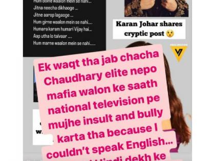 करण जोहरच्या कवितेचा स्क्रीनशॉट पोस्ट करत कंगनाने टोला लगावला आहे. कंगनाने लिहिले, 'एक वेळ अशी होती जेव्हा चाचा चौधरी एलाईट नेपो माफियांबरोबर मिळून नॅशनल टेलिव्हिजनवर माझी टर खेचायचे आणि अपमान करायचे. कारण मला इंग्रजी बोलता यायचे नाही. आज यांची हिंदी पाहून वाटलं, आता तर फक्त तुझी हिंदी सुधारली आहे पुढे बघा काय काय होतं.'