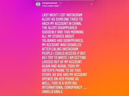 ''ही स्टोरी लिहिण्यासाठी मला माझ्या बहिणीचा फोन वापरावा लागत आहे. हे खूप मोठं आंतरराष्ट्रीय षडयंत्र आहे,''असे कंगनाने लिहिले.