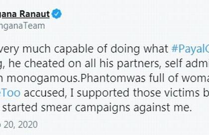 पायल घोषने केलेल्या लैंगिक गैरवर्तनाच्या आरोपाच्या पार्श्वभूमीवर कंगनाने अनुराग कश्यपला पुन्हा लक्ष्य केले. ‘मला ठाऊक आहे त्यानुसार, अनुराग कधीच एकावेळी एका पार्टनरसोबत रिलेशनशिपमध्ये नव्हता. त्याने स्वत:ही याची कबुली दिली आहे. त्याने आपल्या सर्वच जोडीदारांना फसवले आहे.