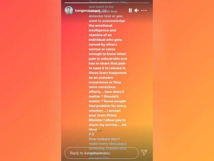 इन्स्टाग्राम स्टोरीवर एक लांबलचक पोस्ट शेअर केली आहे. ‘अश्रू खरे होते वा खोटे... तुम्ही टिअर डिटेक्टर टेस्टमध्ये गुंतून राहणार आहात की दुस-याचे दु:ख बघून तळमळणा-या व्यक्तिच्या भावना स्वीकारणार आहात. वेदना असहनीय होतात तेव्हा त्या व्यक्त कराव्याच लागतात. हे दु:ख वाटावेच लागते. मी तुमचे अश्रू स्वीकातेय... पंतप्रधान मोदीजी मी तुम्हाला तुमचे दु:ख शेअर करू देईऩ...प्रियभारतीयांनो प्रत्येक आशीर्वाद समस्या समजू नका. स्वत:चे अॅटिट्यूट आणि विचार स्वत: ठरवा, असे कंगनाने या पोस्टमध्ये म्हटले आहे.
