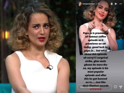 कंगनाने एक इन्टास्टोरी शेअर केली आहे. ‘पापा जो (करण जोहर) आपल्या सर्व लोकप्रिय कॉफी एपिसोडला प्रमोट करतोय. कारण आज हा शो ओटीटीवर येत आहे. पापा जो गुड लक ... पण माझ्या एपिसोडचं काय? ओह सॉरी... सर्जिकल स्ट्राइक, घरात घुसून मारलं होतं ना... माझा एपिसोड त्याचा सर्वाधिक लोकप्रिय एपिसोड होता आणि यानंतर तो टीव्हीवर बॅन झाला होता...,’ असं तिने तिच्या पोस्टमध्ये म्हटलं आहे.