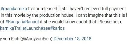 ‘आज मणिकर्णिकाचा ट्रेलर रिलीज झाला. मला अद्यापही प्रॉडक्शन हाऊसने आपल्या कामाचा पूर्ण मोबदला दिलेला नाही,’ असे ट्विट वॉचने केले. अर्थात नंतर त्याने हे ट्विट डिलिटही केले.