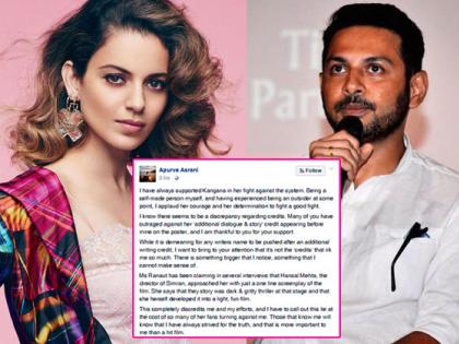 क गणा राणौत आणि वाद यांचे जुने नाते आहे. सध्या ती अशाच काहीशा कारणाने चर्चेत आहे. अर्थात हा वाद नाही. पण फुकटचे श्रेय लाटण्याच्या नादात कंगनाचे पितळ उघडे पडले आहे. कंगना व अपूर्व असरानी यांच्यातील मतभेद यानिमित्ताने चव्हाट्यावर आले आहेत. आता हा अपूर्व असरानी कोण? तर कंगनाचा आगामी सिनेमा ‘सिमरन’चा पटकथालेखक़