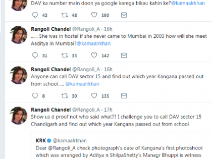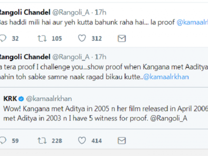 रंगोलीच्या या tweetला केआरकेने उत्तर दिले. ‘कंगना २००५ मध्ये भेटली आणि तिचा चित्रपट एप्रिल २००६ मध्ये रिलीज झाला? माझ्याजवळ पाच साक्षीदार आहेत की, तुझी बहीण कंगना आदित्यला २००३ मध्ये भेटली होती,’ असे tweet केआरकेने केले. या tweetवर रंगोली चांगलीच भडकली. ‘आण पुरावा, मी तुला चॅलेंज करते. कंगना-आदित्य २००३ मध्ये भेटल्याचा पुरावा दे नाही तर सगळ्यांपुढे नाक रगड विकाऊ कुत्र्या,’ असे रंगोली बोलून गेली.