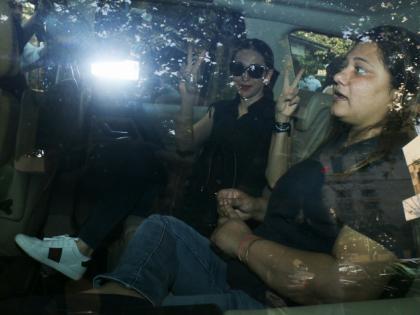आपल्या कारमधूनच आनंदाची खूण करीत माध्यमांना पोज देताना करिनाची मोठी बहिण अभिनेत्री करिष्मा कपूर