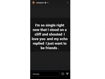 करण जोहरचं सोशल मीडियावर काहीना काही पोस्ट करणं सुरुच असतं. आताही त्याने अशीच एक पोस्ट केली आहे. ज्यामध्ये करणने सध्याचे त्याचे रिलेशनशिप स्टेटस काय आहे त्याबद्दल सांगितले. पोस्टमध्ये त्याने लिहलं, "मी सध्या इतका सिंगल आहे की मी एका खडकावर उभा राहून ओरडलो की मी तुझ्यावर प्रेम करतो. तर माझ्या प्रतिध्वनीने मला फक्त मित्र बनायचं आहे असे उत्तर दिलं".