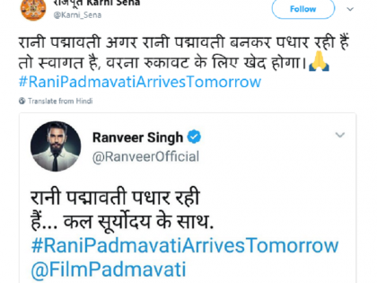 काल रणवीर सिंहने आपल्या twitter अकाऊंटवर ‘पद्मावती’चे पोस्टर पोस्ट केले होते. ‘रानी पद्मावती पधार रही है....सूर्याेदय के साथ...’ असे कॅप्शन या पोस्टसोबत त्याने लिहिले होते. याचे उत्तर देताना राजपूत करणी सेनेने मात्र रणवीरला अप्रत्यक्ष धमकी देऊन टाकली. ‘रानी पद्मावती अगर रानी पद्मावती बनकर पधार रही हैं तो उनका स्वागत हैं, वरना रुकावट के लिए खेद होगा’, असे राजपूत करणी सेनेने आपल्या twitter अकाऊंटवर लिहिले.