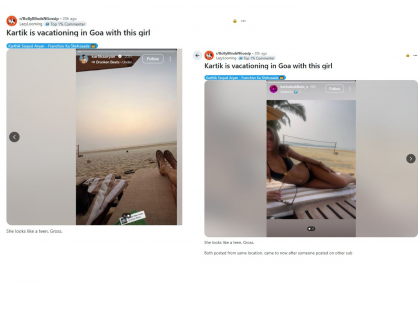नवीन वर्षाच्या निमित्ताने कार्तिक आर्यन गोव्यात सुट्ट्यांचा आनंद घेत होता. त्याने इंस्टाग्रामवर सूर्यास्ताचा आनंद घेतानाचे काही फोटो शेअर केले. मात्र, खरा ट्विस्ट तेव्हा आला जेव्हा 'रेडिट'वर करिना कुबिलियुट नावाच्या महिलेचे फोटो व्हायरल झाले. कार्तिक आणि करिना दोघांनीही शेअर केलेल्या फोटोमध्ये बॅकग्राउंडला एकच 'व्हॉलीबॉल कोर्ट' दिसत आहे. दोघांच्याही बीच बेडवर सारखेच टॉवेल ठेवलेले पाहायला मिळाले. दोघांनीही एकाच वेळी गोव्यातील त्याच समुद्रकिनाऱ्याचे फोटो पोस्ट केले होते.