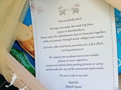 या शाही लग्नात पाहुण्यांना फोन आणण्यास सक्त मनाई आहे. असे या नोटमध्ये नमूद करण्यात आले आहे. त्या चिठ्ठीत लिहिले आहे- 'तुम्ही शेवटी इथे आलात. आशा आहे की तुम्ही जयपूर ते रणथंबोर या रोड ट्रिपचा आनंद घेतला असेल. बसा आणि आराम करा आणि या मचअवेटेड अॅडव्हेंचरचा आनंद घ्या. आपणा सर्वांना विनंती आहे की आपण आपला मोबाईल खोलीतच ठेवून या सोहळ्याला सहभागी व्हावे. या विवाह सोहळ्यातील कोणत्याही कार्यक्रमाचे फोटो तुम्ही कोणत्याही सोशल साईटवर अपलोड करणार नाही, अशी अपेक्षा आहे.
