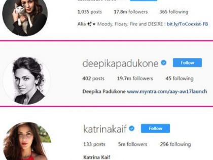 दीपिकाने दोन वर्षांपूर्वी इन्स्टाग्राम ज्वॉईन केले. तर आलिया तीन वर्षांपूर्वी या फोटो शेअरिंग सोशल साईटवर आली. कॅटरिनाला चार महिने १७ दिवसांत ५० लाख फॉलोअर्स मिळालेत. हाच ५० लाखांचा टप्पा गाठायला दीपिका व आलियाला वर्ष लागले होते. सध्या दीपिका व आलियाच्या इन्स्टाग्राम फॉलोअर्सची गोष्ट कराल तर दोघींनी अनुक्रमे १९.७ मिलियन व १७.८ मिलियनचा आकडा पार केला आहे.