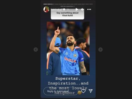 या सेशनमध्ये कतरिनाला एका चाहत्याने भारताचा स्टार क्रिकेटर विराट कोहलीबाबत प्रश्न विचारला. "विराट कोहलीबद्दल काहीतरी सांग" असा प्रश्न चाहत्याने कतरिनाला विचारला. चाहत्याच्या या प्रश्नाला कतरिनाने अगदी मजेशीर पद्धतीने उत्तर दिलं आहे. चाहत्याच्या या प्रश्नाला उत्तर देताना कतरिनाने विराट कोहलीचा फोटो शेअर केला आहे. "सुपरस्टार, आदर्श आणि प्रेमळ शेजारी" असं कतरिनाने म्हटलं आहे. कतरिनाची ही पोस्ट व्हायरल झाली आहे. कतरिना आणि विराट एकमेकांचे शेजारी आहेत.