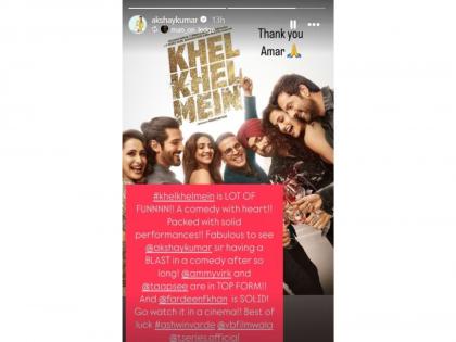 अक्षय कुमार, तापसी पन्नू, वाणी कपूर, फरदीन खान यांचा 'खेल खेल में' सिनेमा काहीच दिवसांमध्ये रिलीज होणार आहे. हा सिनेमा कसा आहे, याविषयी अनेकांना उत्सुकता असेल. तर या सिनेमाविषयी पहिला review समोर आलाय. निर्माते अमर बुटाला यांनी या सिनेमाचा review शेअर केलाय. अमर लिहितात, "खेल खेल में सिनेमात खूप मजा आहे. निखळ कॉमेडी या सिनेमात पाहायला मिळते. खूप काळानंतर अक्षय कुमार सरांना कॉमेडीमध्ये धमाका करताना पाहायला मिळतो. एमी वर्क आणि तापसी पन्नू यांनीही सुंदर काम केलंय. फरदीन खानही दमदार आहे. हा सिनेमा आताच्या आता सिनेमागृहांमध्ये जाऊन बघा. खूप शुभेच्छा." असं म्हणत अमर बुटाला यांनी अक्षयच्या सिनेमाचं कौतुक केलंय.