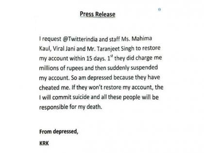 त्याचे झाले असे की, केआरकेने काही दिवसांपूर्वी एक प्रेसनोट रिलीज करताना धमकी दिली होती की, पुढच्या पंधरा दिवसांत जर माझे अकाउंट सुरू केले गेले नाही तर मी आत्महत्या करणार. हे प्रकरण तेव्हा सुरू झाले जेव्हा मिस्टर परफेक्टनिस्ट आमीर खानचा ‘सीक्रेट सुपरस्टार’ हा चित्रपट रिलीज होण्याअगोदरच नेहमीप्रमाणे केआरकेने त्याचा रिव्ह्यू ट्विटच्या माध्यमातून पोस्ट केला होता. त्याचदरम्यान त्याने चित्रपटाचा क्लायमॅक्सही रिलीज केला. ज्यामुळे त्याचे ट्विटर अकाउंट सस्पेंड करण्यात आले.