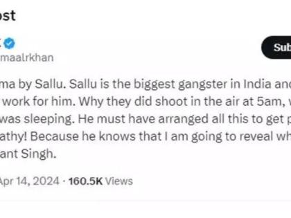 KRK ने ट्विट करुन लिहिलंय की, "हा सर्व सलमान खाननेच रचलेला ड्रामा आहे. सल्लू भारतातील सर्वात मोठा गँगस्टर असून बाकी सर्व गँगस्टर त्याच्यासाठी काम करतात. जेव्हा सर्व लोकं पहाटे ५ वाजता झोपले होते तेव्हाच सल्लूने हवेत गोळीबार का केला. लोकप्रियता आणि सहानुभुती मिळवण्यासाठी सलमानने या सगळ्या प्रकाराची सोय केली होती. कारण त्याला माहितीय की त्याने सुशांत सिंग राजपूतसोबत काय केलंय याचा मी लवकरच खुलासा करणार आहे."