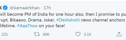 ‘मला तासाभरासाठी पंतप्रधान बनवले तर मी पहिल्यांदा या ड्रामेबाज जोकर न्यूज अँकर्सना नेहमीसाठी तुरुंगात डांबेल. यांच्या चेह-यावर थुंकण्याची इच्छा होते,’ असे केआरकेने लिहिले.