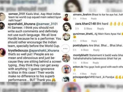 क्रिस्टल तू पहिल्यांदाच हार्दिकला भाऊ म्हणून मोकळी झालीस, हे चांगले केलेस, , असे एका युजरने लिहिले. तर अन्य एका युजरने, ‘चहात जशी चहा पावडर घालण गरजेचे असते तेवढेच हार्दिकला भाऊ म्हणणे गरजेचे आहे’, असे लिहित क्रिस्टलला ट्रोल केले. एका युजरने थेट हार्दिकवर वर्णभेदी टीका केली. ‘तू वेस्ट इंडिजला का नाही जात,’असे या युजरने लिहिले. युजरची ही वर्णद्वेषी प्रतिक्रिया पाहून अभिनेता अपारशक्ति खुराणाला राहावले नाही आणि तो हार्दिक आणि क्रिस्टलच्या मदतीला धावून आला. हार्दिक एक चांगला खेळाडू आहे. निदान वर्डकपच्या आधी त्याच्याबाबत अशाप्रकारच्या गोष्टी आपण बोलायला नको, असे अपारशक्तीने या युजरला सुनावले. यावर क्रिस्टलनेही आपली प्रतिक्रिया दिली. खूप छान अपारशक्ती, लोक स्क्रिनच्या मागे राहून वाट्टेल ते लिहितात. अशा लोकांकडे दुर्लक्ष करणेच उत्तम, असे क्रिस्टलने लिहिले.