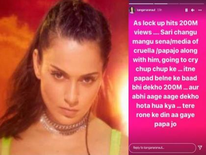 इन्स्टास्टोरीवर तिने एक पोस्ट शेअर केली आहे. ती लिहिते, ‘लॉक अप शोने 200 मिलियन ह्युजचा आकडा पार केला आहे आणि सर्व चंगू/मंगू सेना/ क्रूएलाची मीडिया आणि पापा जो चोरून लपून रडणार आहेत. त्यांनी इतकं करूनही बघा 200 मिलियनपर्यंत पोहोचलोच. आता पुढे बघा आणखी काय काय होतं? तुझे रडण्याचे दिवस आले आहेत पापा जो... ’