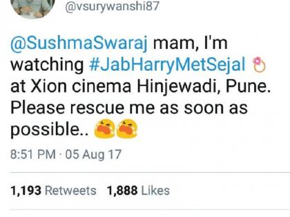 मॅडम, मला वाचवा; ‘जब हॅरी मेट सेजल’ पाहण्यासाठी गेलेल्या प्रेक्षकाने सुषमा स्वराज यांना केले tweet!