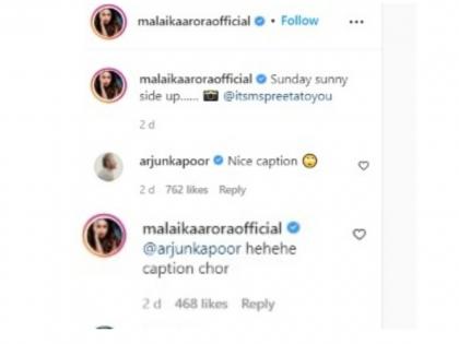 दरम्यान, मलायकाचा फोटो पाहिल्यावर अर्जुनने 'चांगलं कॅप्शन आहे', अशी कमेंट केली आहे. या कमेंटमागील अर्थ मलायकाला समजल्यानंतर 'हाहाहा..कॅप्शन चोर', असं प्रत्युत्तर तिने दिलं आहे. सध्या अर्जुन त्याच्या आगामी 'एक व्हिलन रिटर्न्स' या चित्रपटामध्ये बिझी आहे. या चित्रपटात त्याच्यासोबत दिशा पटानी, जॉन अब्राहम आणि तारा सुतारियादेखील झळकणार आहेत.