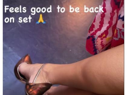 मलायका अरोराने तिच्या इंस्टाग्राम स्टोरीवर सेटवरील एक फोटो शेअर केला आहे. ज्यामध्ये ती गोल्डन हिल्स घातलेली दिसत आहे. फोटो शेअर करताना मलायकाने लिहिले - सेटवर परत आल्याने