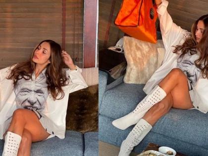 या फोटोंमध्ये मलायका ओव्हर साइज शर्टमध्ये दिसतेय. पांढरा शर्ट, पायात पांढरे बुट्स आणि मोकळे केस असा तिचा अवतार आहे. शर्टचे म्हणाल तर त्यावर लेखक व कवी चार्ल्स बुकोस्कीचे पोट्रेट दिसतेस. आपल्या या लूकसोबत मलायकाने ब्राइट आॅरेन्ज बॅग कॅरी करत ग्लॅमरस पोज दिल्या आहेत.