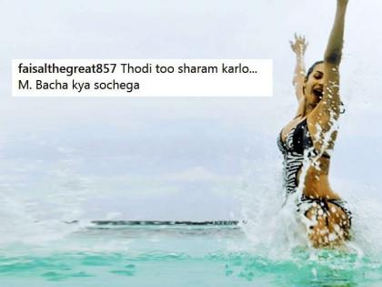 तुलिका नावाच्या एका यूजरने लिहिले की, एक आई बिकिनीमधील तिचे असे फोटो कसे काय पोस्ट करू शकते?, फैजल नावाच्या अन्य एका यूजरने लिहिले की, ‘थोडी तर लाज बाळग, मुलगा काय विचार करणार?’ यूजर्सच्या या संतापजनक कॉमेण्टवर मलाइकाने मात्र अद्यापपर्यंत कुठल्याही प्रकारची रिअॅक्शन दिली नाही. या अगोदर जानेवारी २०१८ मध्ये मलाइकाने शेअर केलेल्या गोल्डन गाउनमधील फोटोमुळे ट्रोलर्सच्या निशाण्यावर आली होती. त्यावेळी एका यूजरनी लिहिले होते की, ‘या वयात न्यूडिटी दाखविण्यासाठीच तू नवºयापासून विभक्त झालीस काय?’ वास्तविक मलाइका या अगोदरही बºयाचदा तिच्या बोल्ड ड्रेसमुळे यूजर्सच्या निशाण्यावर आली आहे.