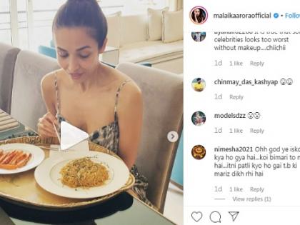 मलायकाच्या नो मेकअप लूकवरूनही युजर्सनी तिला ट्रोल केले. ‘मेकअपविना सेलिब्रिटी खरच खूप भयंकर दिसतात,’ असे काहींनी लिहिले. अन्य एकाने ‘आता तू चित्रपट विसर. तुझे करिअर संपले, असे समज’ अशी प्रतिक्रिया दिली. तर एकाने ‘हड्डीयों का ढेर’ अशा शब्दांत तिला ट्रोल केले.