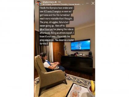 मनू भाकरने इन्स्टाग्रामवर फोटो शेअर केला आहे. यात ती खुर्चीवर बसून टीव्हीवर कार्तिक आर्यनचा 'चंदू चॅम्पियन' पाहताना दिसत आहे. यासोबत तिने कॅप्शनमध्ये लिहिले, " अखेर ऑलिम्पिक संपलं आहे आणि घरी पोहोचताच मी चंदू चॅम्पियन पाहिला. हा सिनेमा जितका मला रिलेटेबल वाटला होता त्याहून जास्त निघाला. सराव, स्ट्रगल, अपयश पण कधीच हार न मानणं. ही भूमिका इतक्या सहजतेने केल्याबद्दल कार्तिक आर्यनचं कौतुक. एक अॅथलीट म्हणून मला माहितीये हे सोपं नाही..विशेषत: तो सरावाचा सीक्वेन्स..यासाठी तुला मेडल मिळायला हवं."