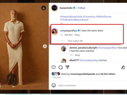टीव्ही अभिनेत्री सोन्या अयोध्या हिने मिलिंद सोमण यांच्या या फोटोवर कमेंट करत तिच्याकडेही सेमच ड्रेस असल्याचं दिसत आहे. एकाने कमेंट करत "सॉरी पण हा ड्रेस चांगला दिसत नाहीये", असं म्हटलं आहे. तर दुसऱ्याने "हे अजिबात कूल वाटत नाहीये", अशी कमेंट केली आहे.