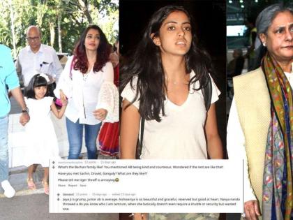 एकाने बच्चन कुटुंबियांबाबत विचारले असता त्यांनी सांगितले. जया बच्चन या काहीशा गोंधळलेल्या असतात. अभिषेक बच्चन चांगला आहे. ऐश्वर्या खूपच कमी बोलत असली तरी ती मनाने चांगली आहे. नव्या नवेलीला नेहमीच सिक्युरीटी हवी असते. मी कोण आहे हे माहीत आहे का अशाप्रकारची तिची वागणूक असते.