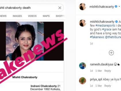 एका फेक मॅसेजचा स्क्रिनशॉट शेअर करत तिने लिहिले, ‘काही मीडिया रिपोर्टनुसार, माझे आज निधन झाले. परंतु परमेश्वराच्या कृपेने मी जिवंत आहे आणि अगदी ठणठणीत आहे. मला खूप पुढे जायचे आहे मित्रांनो,’ असे मिष्टी चक्रवर्तीने लिहिले.