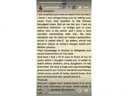 मुकेश खन्ना यांनी लिहिले, "प्रिय सोनाक्षी, तू उत्तर द्यायला एवढा वेळ घेतलास याचं आश्चर्य वाटतंय. मला माहितीये प्रसिद्ध करोडपती शोमधील त्या एपिसोडवरुन मी तुझ्या विरोधात बोललो. पण मी सांगू इच्छितो की तुझ्या किंवा तुझ्या वडिलांच्या (जे माझे सीनिअर आहेत आणि ज्यांच्यासोबत माझा खूप छान बाँड आहे) प्रतिष्ठेला ठेच पोहोचवण्याचा माझा उद्देश नव्हता. माझा उद्देश आजच्या पिढीवर बोलण्याचा होता ज्यांना GEN Z म्हटलं जातं. हे लोक गूगल आणि मोबाईल फोनचे गुलाम झाले आहेदत. यांचं ज्ञान युट्यूब आणि विकिपीडियापर्यंतच मर्यादित आहे. माझ्यासमोर HI FI सेलिब्रिटीचं म्हणजेच तुझं उदाहरण आलं ज्याचा उपयोग मी एकंदर या पिढीविषयी बोलण्यासाठी केला होता. या पिढीला उपदेश देण्यासाठी केला होता. वडील, मुलं, मुली यांना मला सांगायचं होतं की आपल्याकडे संस्कृती, परंपरा आणि एवढा इतिहास आहे जे आजच्या प्रत्येक तरुणाला माहित असलं पाहिजे. फक्त माहित नाही तर त्यांना याचा अभिमान असला पाहिजे. इतकंच. आणि हो, मी तुझं उदाहरणं माझ्या अनेक मुलाखतींमध्ये दिलं ज्याबद्दल मी खेद व्यक्त करतो. पॉईंट नोटेड. असं परत घडणार नाही याची खात्री देतो. काळजी घे."