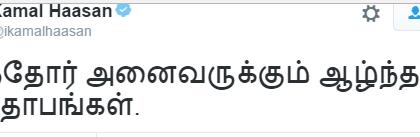 ए ीकडे जयललिता यांच्या निधनाने तामिळनाडूमध्ये शोककळा पसरली आहे.सर्वच माध्यामतून सोशल मीडियावरून जयललिता यांना श्रध्दांजली वाहण्यात येत आहे.मात्र दुसरीकडे कमल हसनच्या वादग्रस्त ट्वीटमुळे सोशल मीडियावर वातावरण तापलेले पाहायला मिळत आहे.कमल हासन यांनी ''जयललिता यांच्यावर अवलंबून असणा-यांसोबत माझी सहानभूती आहे'' असे तामिळ भाषेत ट्विट केले. यांवर नेटीझन्सने कमल हसनला चांगलेच धारेवर धरल्याचे पाहायला मिळाले. कमल हसन यांना नेमके म्हणायचे तरी काय आहे? अशा शोकाकुल वातावरणातही कमल हसनने वादग्रस्त व्टीट करण्याची संधी देखील सोडली नाही.त्यामुळे नेटीझन्सने त्यांच्यावर राग ओकत आपल्या भावना व्यक्त केल्या आहेत.