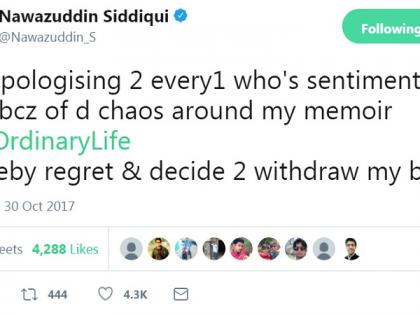 आ ले ‘अॅन आॅर्डीनरी लाइफ’ हे जीवनचरित्र इतके गाजेल, याची कल्पना खुद्द नवाजुद्दीन सिद्दीकीलाही नसेल. नवाजुद्दीनचे आयुष्य जगजाहिर करणा-या या पुस्तकाचे काही दिवसांपूर्वीच प्रकाशन झाले. पण प्रकाशन होऊन उणेपुरे आठ दिवस होत नाहीत तोच, नवाजने हे पुस्तक मागे घेण्याचा निर्णय घेतला आहे. नवाजने त्याच्या अधिकृत टिष्ट्वटर अकाऊंटवर याबाबतची घोषणा केली आहे.