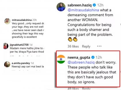 एका महिलेनेच नीना गुप्तांबाबत केलेली अशी कमेंट पाहून चाहता भडकला. तो म्हणाला, "एक महिलाच दुसऱ्या महिलेला असं बोलत आहे. बॉडी शेमरचं काम केल्याबद्दल तुमचं अभिनंदन". त्याच्या या कमेंटवर नीना गुप्तांनी कमेंट करत रिप्लाय दिला आहे. "काळजी करू नका. जे लोक अशा पद्धतीने कमेंट करतात ते माझ्यावर जळतात. कारण, त्यांच्याकडे माझ्यासारखा फिटनेस नाही. त्यामुळे दुर्लक्ष करा", असं म्हणत नीना गुप्तांनी सणसणीत चपराक लगावली आहे.
