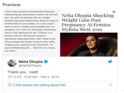 नेहा धुपिया बाळाच्या जन्मानंतर तिचे मदरहुड एन्जॉय करत आहे. तिच्या प्रत्येक घडामोडी ती सोशल मीडियावर शेअर करत असते. गेल्या वर्षी 18 नोव्हेंबरला तिने मेहरला जन्म दिला होता. मेहरच्या जन्मानंतर तिचे वजन वाढल्याचे तिने पोस्ट केलेल्या फोटोत पाहायला मिळतंय. याच फोटोंमुळे नेहा वारंवार सोशल मीडियावरही ट्रोल झाली. मात्र काही दिवसांपूर्वीच एका न्युज वेबसाईटने नेहाच्या वाढत्या वजनावर टीकाही केली होती. यावेळी मात्र नेहाचा चांगलाच पारा चढला आणि तिने शांत न बसता त्या न्युजचा स्क्रीनशॉट शेअर करत चांगलेच खडे बोल सुनावल्याचे पाहायला मिळत आहे. फॅट शेमिंगला मी किती महत्त्व द्यावे हे मी ठरवेन. फक्त सेलिब्रेटीच नव्हे तर इतरांनीही या गोष्टीला इतके महत्त्व देऊ नये.
